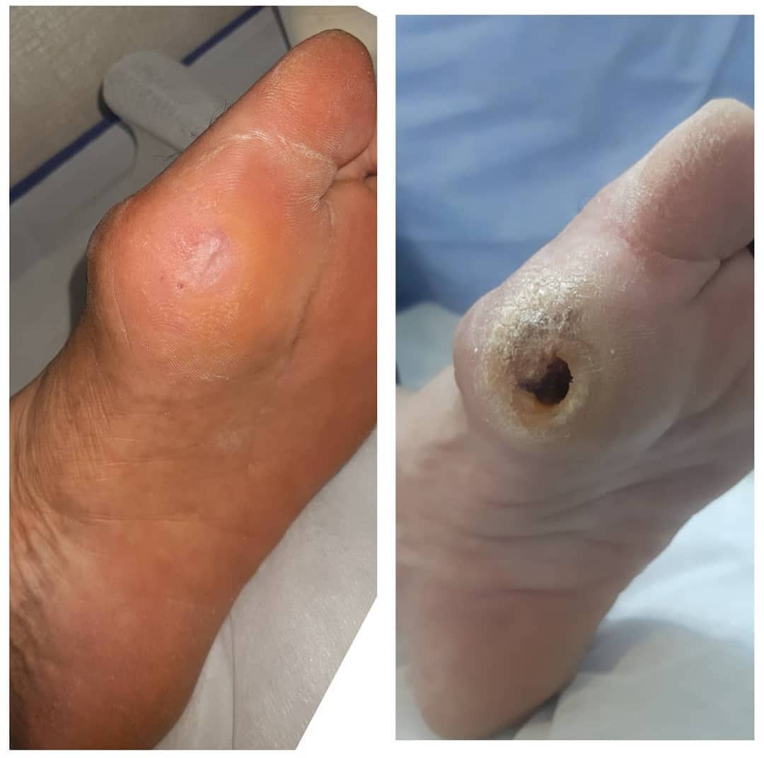 زخم پای دیابتی در بیماران مبتلا به نوروپاتی (ناشی از بیماری دیابت) که به علت تروماهای ظریف و مکرر (ضربه) در پا بخصوص استخوان های کف پا که تحمل وزن می کنند (زیر قاعده انگشت شست) بروز می کند. معمولا در زخم های ساده (uncomplicated) برخلاف انواع پیشرفته (complicated)، خونرسانی پا سالم (نبض نرمال) است. “علت آسیب بیشتر” در نوروپاتی، آتروفی یا لاغر شدن ماهیچه ها و در نتیجه بهم ریختگی و دفورمیتی آناتومی کف پا یا “intrinsic minus deformity” (دررفتگی نسبی مفاصل، pes cavus و claw toes)، بروز مفصل شارکو و متعاقب آن فشارهای متحمل در محل برجستگی ها می باشد. این بدشکلی ها (دفورمیتی) ابتدا از زیر انگشتان (forefoot) و رفته رفته به سمت عقبتر (midfoot) و سپس پاشنه (hindfoot) کشیده می شوند و زخم اغلب روی برجستگی های استخوانی بروز می کند. زخم معمولا لبه منظم و سفت (callus) دارد .این نوع زخم در دیگر بیماری های نوروپاتیک مثل جذام یا نوروپاتی های ارثی نیز دیده می شوند ولی شایعترین علت آن دیابت ملیتوس یا مرض قند است.
